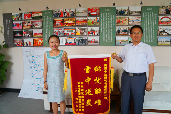 9月1號下午,如皋港區管委會副主任王洪海一行來到南通公司,將印有“雪裏送碳、排憂解難”的錦旗遞到總經理譚彥手中,感謝南通公司為港區高級中學“搶時間、保通氣”,解决了學校9月1日開學2000多名師生伙食供應的難題。