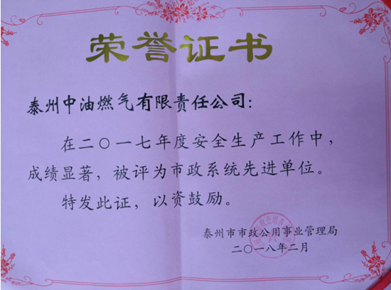 近日,泰州中油燃氣有限責任公司被泰州市住建局評為 2017年度“市政系統先進單位”,總經理丁濤榮獲“市政系統先進個人”。這是泰州公司建設史上首次獲得這一榮譽。