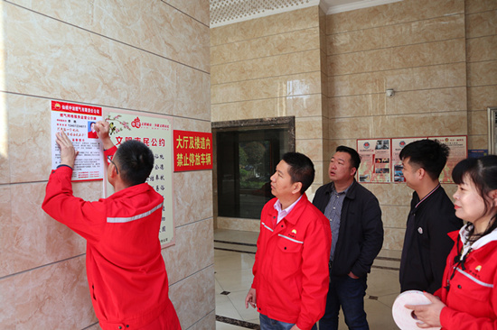 元泰未來城作為仙桃最大的社區之一,活動第一站便選擇在這裡。上午9時許,網格服務員在社區物業人員的帶領下,在元泰未來城社區各出入口、物業辦公室和樓棟入口進行了“燃氣網格服務監督公示牌”的張貼,並向周邊在場居民進行宣傳,引導用戶關注公司微信公眾號,告知用戶在用氣時遇到困難來如何快速解決問題,得到了用戶積極配合和高度贊許。