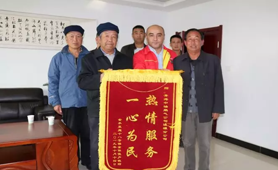 “這是我們的一片心意,感謝天然氣公司,讓我們在供暖期前用上天然氣。”10月14日,湟源縣金水豪庭十八號樓6位住戶代表來到青海中油燃氣投資有限責任公司湟源公司將印有“熱情服務、一心為民”的錦旗送到總經理李欣悅的手上。