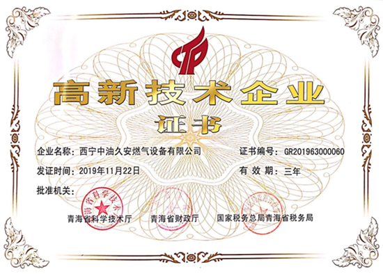 歲末年初,玉鼠獻瑞。近日,西寧中油久安燃氣設備有限公司繼2016年首次取得“高新技術企業”認定後,再次榮獲青海省2019年高新技術企業認定。通常高新技術企業具有優秀的科技人才和研發團隊,競爭力強,這一殊榮的獲得,是青海省對西寧中油久安燃氣設備有限公司研發和技術創新能力的充分肯定。