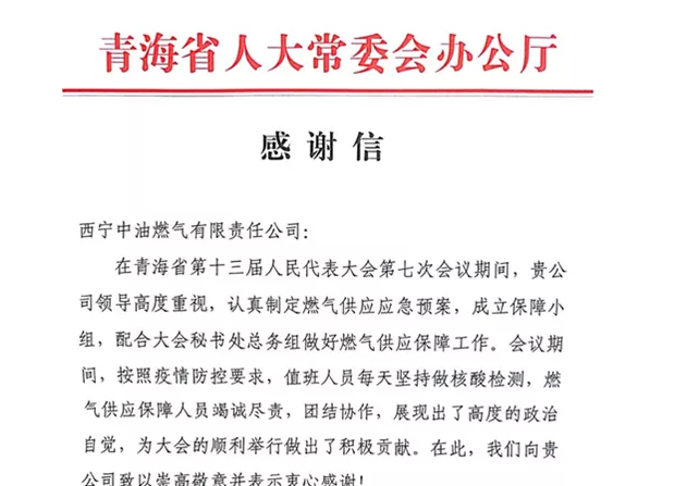 1月27日,西寧中油燃氣收到青海省十三屆人大第七次會議秘書處發來的感謝信,對公司在省十三屆人大七次會議期間燃氣保障工作表示高度認可和衷心感謝。