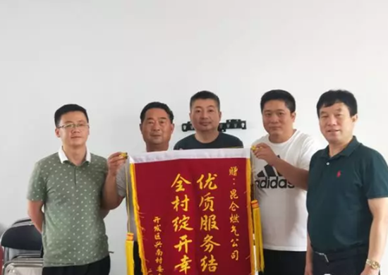 西十自然村是公司开发的第一个居民用户,也是难度较大最具影响力的一个居民用气点,村民的房屋坐落错综复杂且房屋建筑更是各式各样,因此给铺设管道带来很多困难。入户安装更是家家户户似相近,户户人家各不同,149户居民就有149个方案,但是大家并没有因为困难就放弃,因为难做就拖延。根据每户居民的需求上门勘探设计最佳方案,公司领导多次去现场考察,为了让村民早日用上天然气,在时间紧、任务重、人手紧缺的情况下,各部门密切配合加班加点,终于在八月中旬西十村所有用户都用上了天然气。这一刻,看到村民眼中流露的喜悦,大家心里觉得一切都值得。也是因为大家的敬业精神和不辞劳苦,遇事不退缩不推诿的精神给当地村民留下昆仑公司为人民服务的好影响,也在当地树立了良好的口碑。为表谢意村民委托村支书代表村民送来锦旗和感谢信。