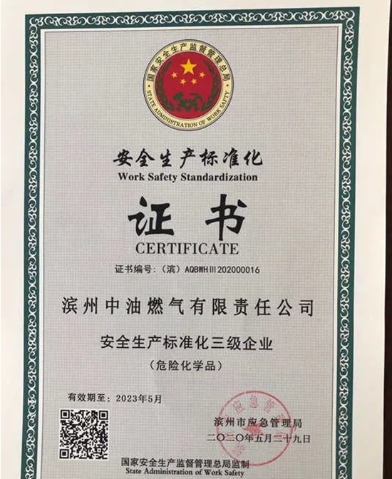近日,滨州中油燃气获得市应急管理局颁发的“国家安全生产标准化三级企业”证书,标志着公司安全管理工作踏上新的征程。