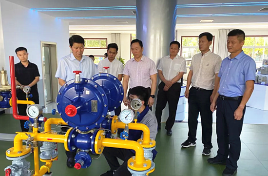张宝亮一行先后对公司实训中心、检测中心、PE燃气管材、调压设备生产车间及调压器项目部进行实地参观调研,并认真听取了公司发展相关情况汇报。