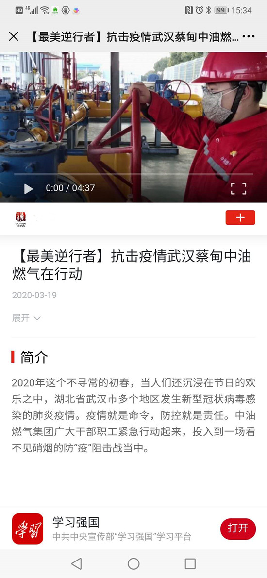 《学习强国》:抗击疫情,武汉蔡甸中油燃气在行动