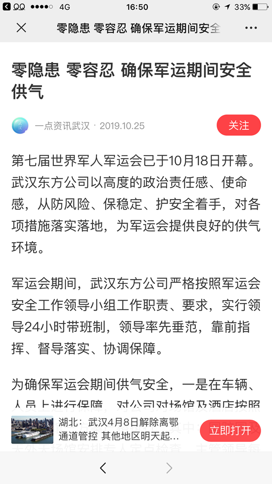 《一点资讯武汉》:零隐患 零容忍 确保军运期间安全供气