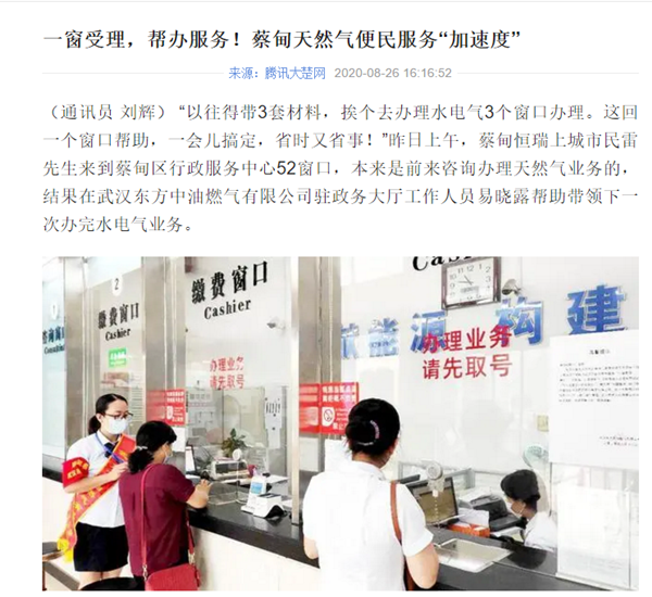 《腾讯大楚网》:一窗受理,帮办服务,蔡甸天然气便民服务“加速度”