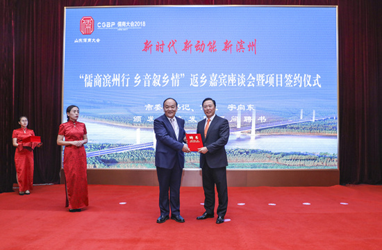 9月30日下午,山东省“儒商大会2018”闭幕后,滨州市举行主题为“新时代 新动能 新滨州”的“儒商滨州行,乡音叙乡情”返乡嘉宾座谈会暨签约仪式。