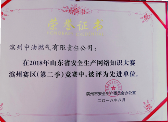 近日,为进一步增强企业安全生产主体责任意识,提高全民安全素质,山东省政府安委会办公室联合大众网举办2018年全省安全生产网络知识大赛(第二季)。滨州中油燃气有限责任公司高度重视,认真组织,积极参加,取得优异成绩,被评为全省安全生产网络知识大赛滨州赛区(第二季)“先进单位”,受到了滨州市安委办的表彰。
