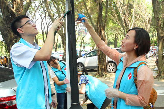 14時,公園內遊人如織,行動正式開始。大家帶上小水桶、抹布、刮刀等工具,分小組包乾到人,以飽滿的熱情投入到清除工作中。經過兩個多小時的奮戰,共清理各類垃圾五大塑膠袋。看著用汗水換來的戰利品,大家都露出了幸福的笑容。活動結束後,大家向珠海全體市民發起倡議,從節約電、水、紙張,到廢舊電池回收和綠色出行等七個方面,承諾保護環境,低碳生活,從自已做起,讓珠海藍天更潔淨,大海更清澈。