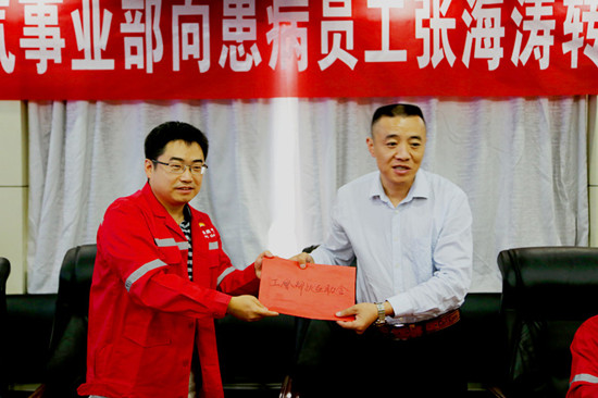 今年5月張海濤被青海大學附屬醫院確診為重型再生障礙性貧血I型,治癒需要做骨髓移植手術。對於一個普通家庭來說,手術費用和後續治療費用數額實在太大。青海燃氣事業部和中油中泰西部區域工會聯合會的領導得知張海濤的病情後,非常重視,要求工會聯合會向青海燃氣事業部下屬10家公司的員工發出愛心捐款倡議,號召全體員工盡自己的綿薄之力。