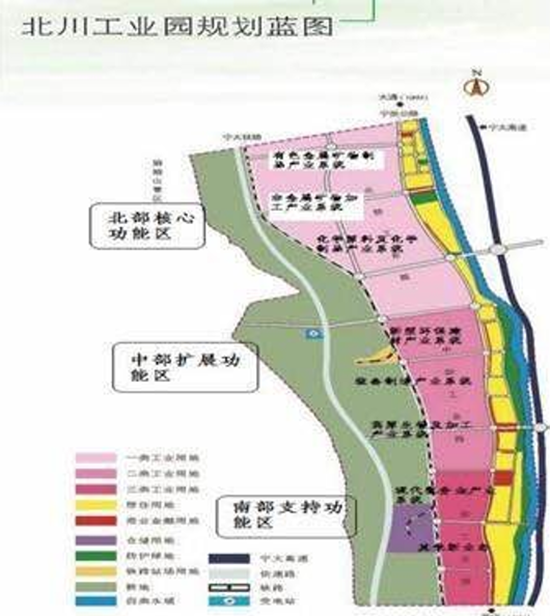 北川工業園區於2008年10月經西寧市人民政府批准掛牌成立,園區總占地面積2145公頃,是國家級鋁鎂合金基地。2013年,新規劃面積由原來的2145公頃擴大至7024公頃,園區分為北部核心功能組團、東北部擴展功能組團、中部核心功能組團、中部擴展功能組團、南部支援功能組團。2014年底園區內入駐企業192家,計畫在2020年底工業產值達500億元。