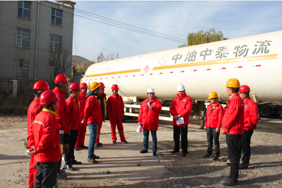 演練模擬公司一台運輸車輛運輸完畢返回停車場停放時,輪胎突然起火,駕駛員立即對輪胎進行滅火。押運員在警戒過程中發現槽車管路有LNG輕微洩露,情況十分危機,現場人員立即實施救援並及時報告應急救援小組,應急救援小組立即報告指揮中心並啟動救援預案開展救援。
