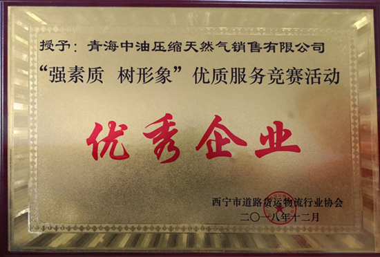 12月14日,青海中油壓縮天然氣銷售有限公司車隊在西寧市道路貨運物流行業協會主辦的道路貨運物流行業協會年會(暨安全生產大會)上,榮獲獲《“強素質樹形象”優質服務競賽優秀企業》獎。