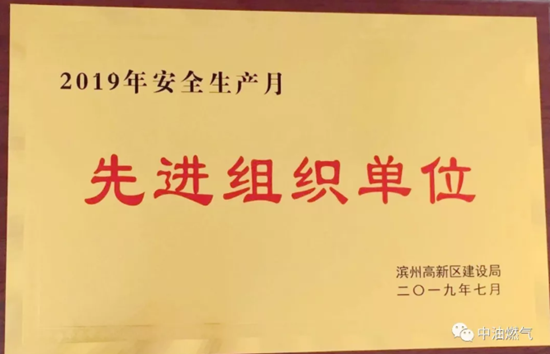 近日,濱州高新區建設局授予濱州中油燃氣高新有限責任公司 “2019年安全生產月先進組織單位”稱號,以表彰濱州高新公司在2019年度安全生產月工作中所取得的成效。