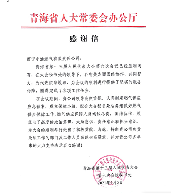 2月5日,省人大常委會辦公廳向西寧中油燃氣發來感謝信,對西寧中油燃氣在省十三屆六次會議期間,高度重視,周密部署,盡職盡職,以高度的政治意識、大局意識、責任意識和擔當意識做好燃氣供應保障工作,為大會的順利舉行做出積極貢獻表示感謝。