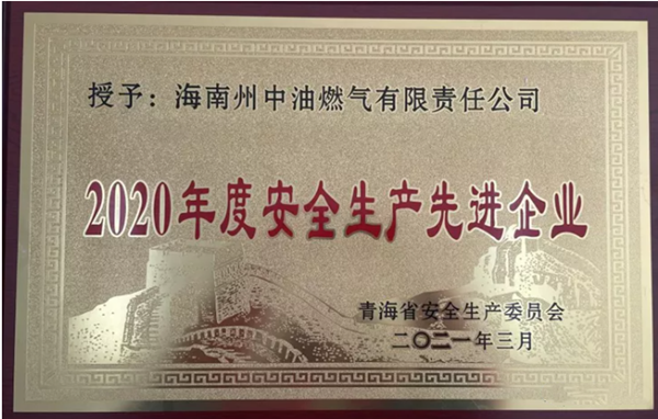 2020年,海南州中油燃氣有限責任公司在上級政府主管單位及集團公司的正確領導下,緊緊圍繞“安全第一、預防為主、綜合治理”的安全生產方針,著力提升公司安全管理水準,不斷夯實安全生產基礎,嚴守安全底線,推進“一崗雙責”“三個必須”安全工作,經省安委會考核,被青海省安全生產委員會授予“2020年度安全生產先進企業”榮譽稱號。