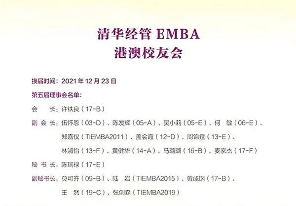 2021年12月23日,清華經管EMBA港澳校友會第五屆理事會成功換屆,集團董事局主席許鐵良先生被推選為新一屆校友會會長。