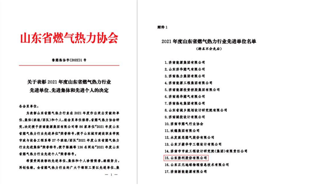 近日,山東省燃氣熱力協會公佈了《關於表彰2021年度山東省燃氣熱力協會先進單位、先進集體和先進個人的決定》(魯燃熱協字[2021]1號),對在2021年度燃氣熱力行業中做出突出貢獻的單位及個人進行表彰。山東勝利股份有限公司被授予“2021年度先進單位”榮譽稱號。這也是公司連續第三年,榮獲山東省燃氣熱力協會“先進單位”榮譽稱號。